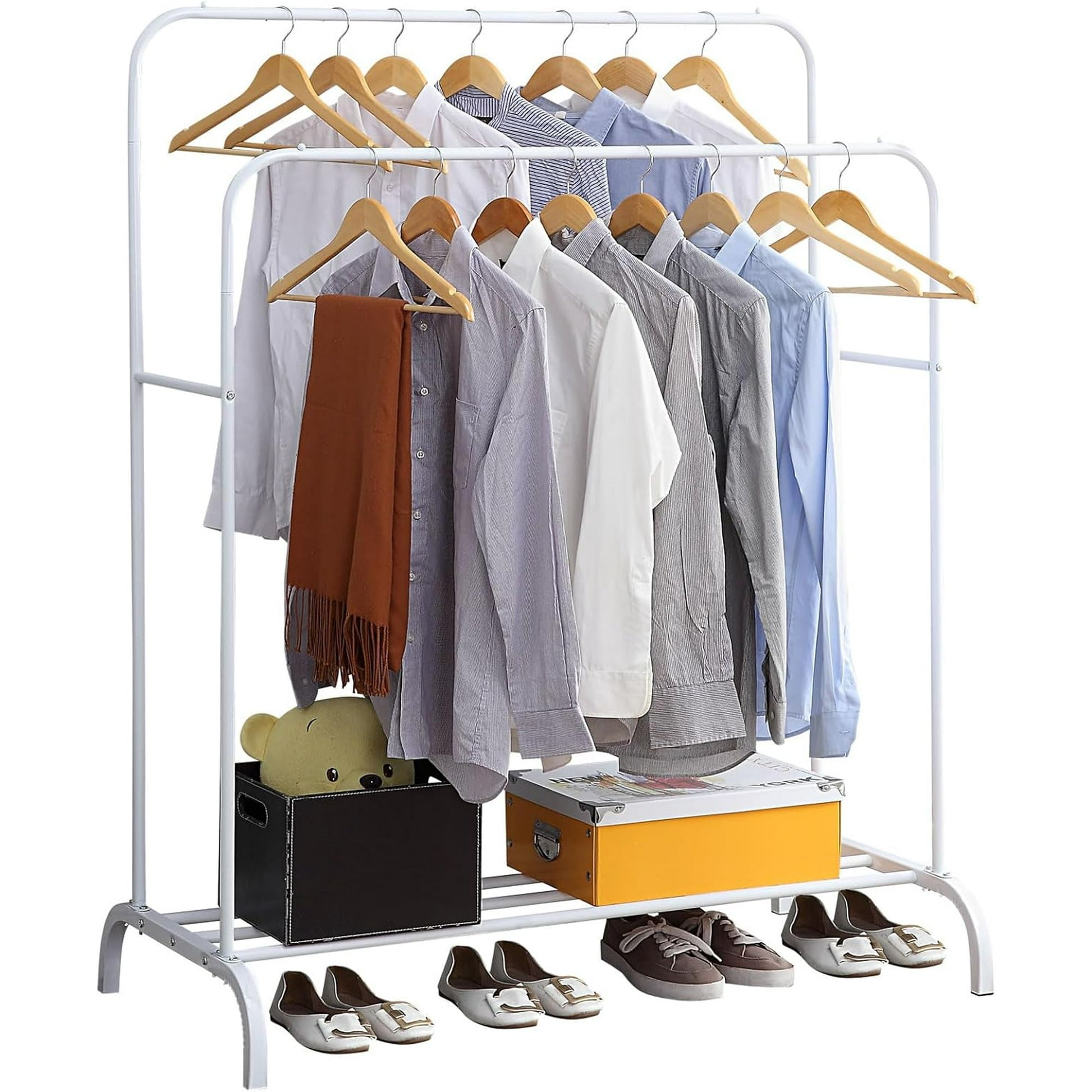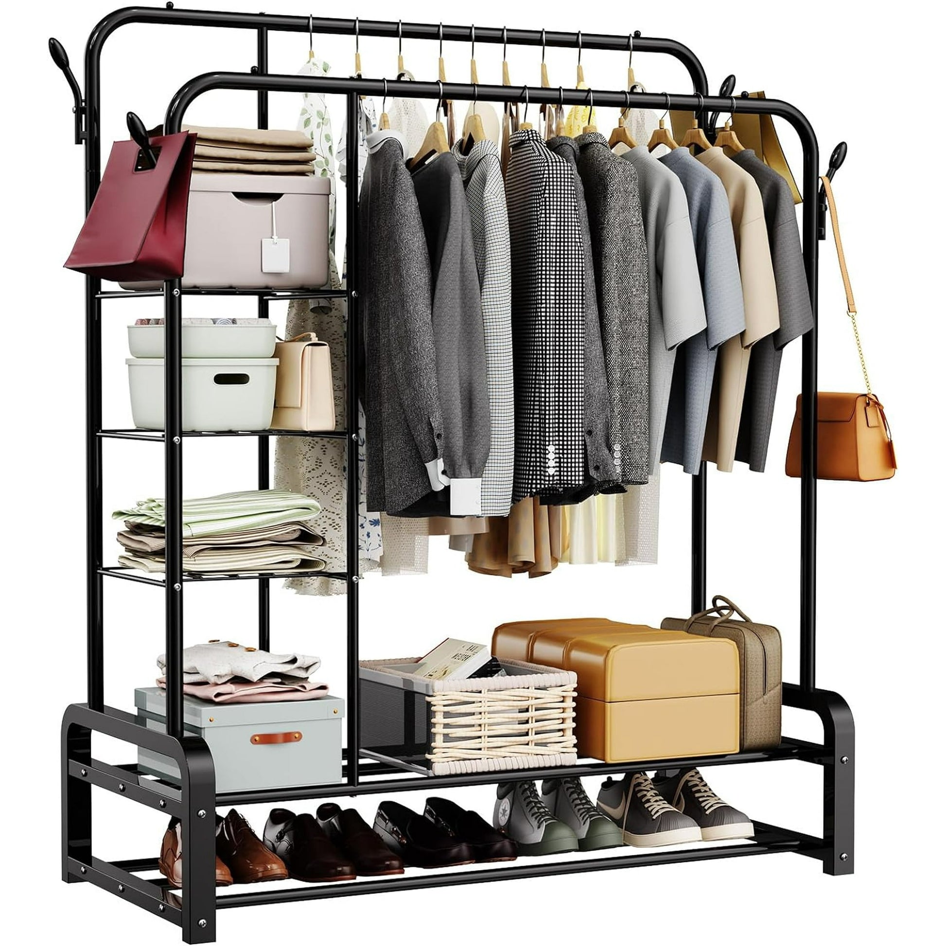 Clothes Rack,Clothing Racks with 4 Hooks and Storage Shelves,Double Garment Rack for Clothes, Coats, Bags, Shoes, Boots